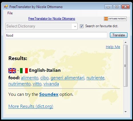 Traduttore gratuito simile a Babylon Translator creato da Nicola Ottomano. Traduce in molte lingue come Italiano, Inglese, Francese, Danese, Svedese, Finlandese, Tedesco, Spagnolo, Russo, Greco, Coreano, Giapponese, Polacco, Olandese, Arabo, Afrikaans, Bulgaro, Ceco, Indonesiano, Gallese, SerboCroato, Ainu e molte altre lingue. Creato in 3 versioni: -Versione PC: Versione graficamente molto bella e con tutte le funzioni attivate. Pienamente compatibile con .NET Framework 2.0 e Mono 2.0.x Framework. Gira su Windows, Linux e Mac OSX. -Versione Android: Gira su dispositivi Android. Richiede Android 1.6 o superiore -Versione PocketPC: Gira su PocketPC 2003 e Windows Mobile. Richiede .NET Compact Framework 2.0 -WM6 Smartphone Edition: Gira su Smartphone equipaggiati con Windows Mobile 6. Richiede .NET Compact Framework 2.0